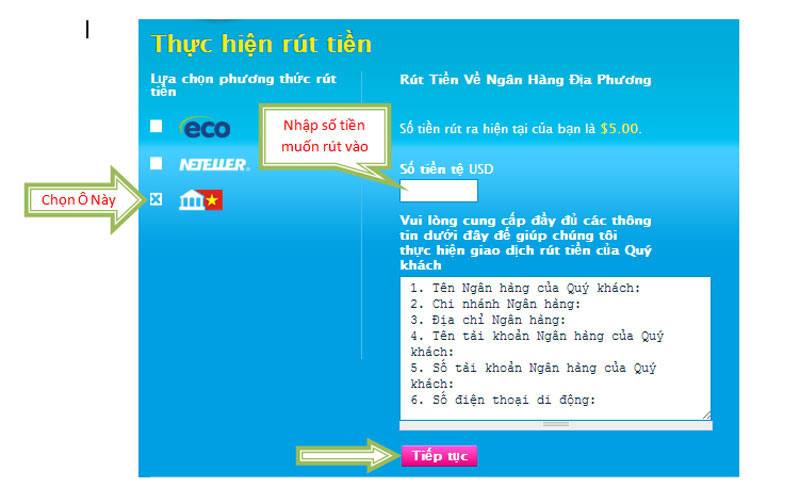 Tại giao diện rút tiền chính của phương thức thanh toán qua ngân hàng địa phương thì nhà cái sẽ tiến hành yêu cầu bạn điền số tiền cần rút trong giới hạn được cho phép.